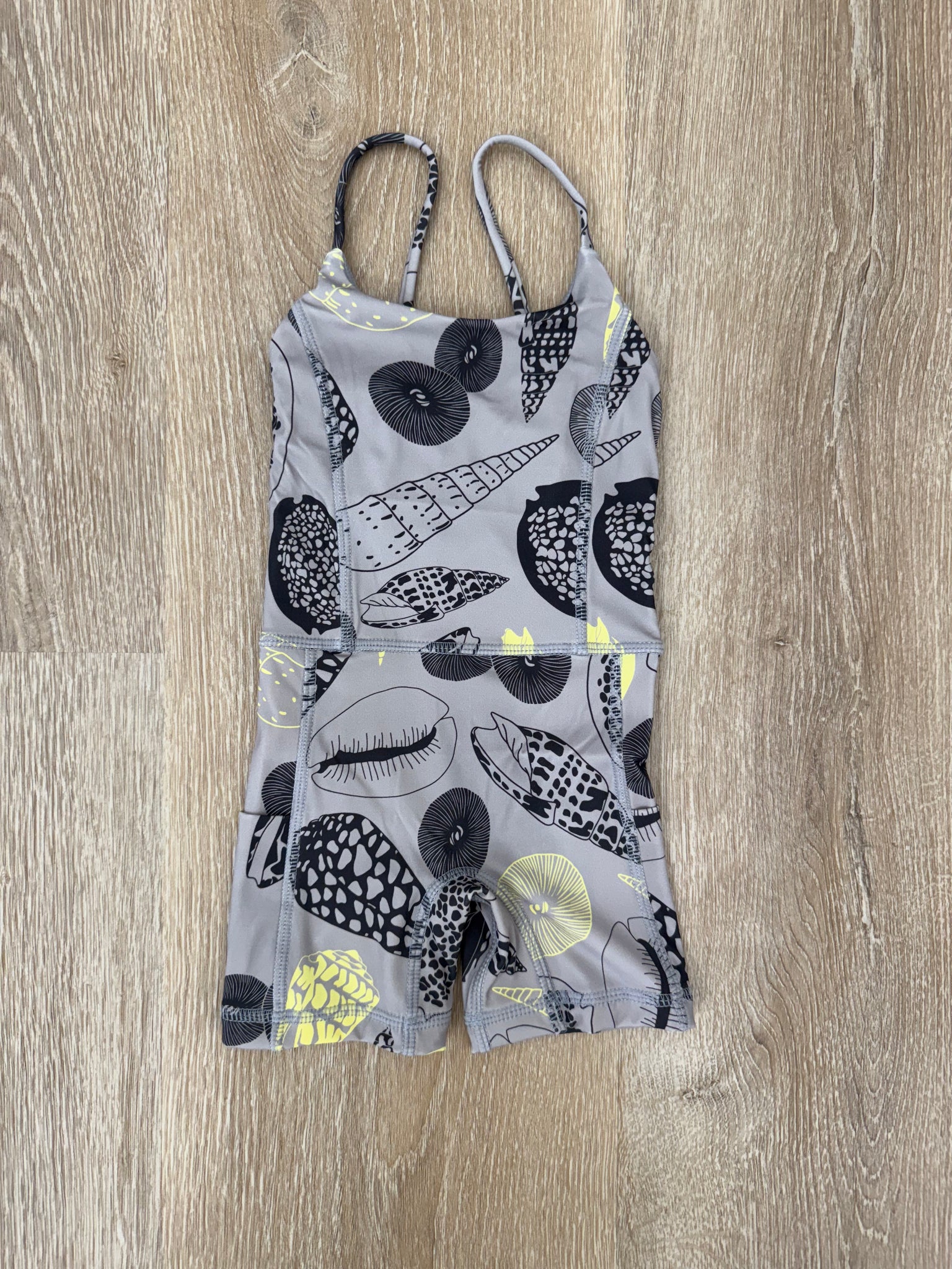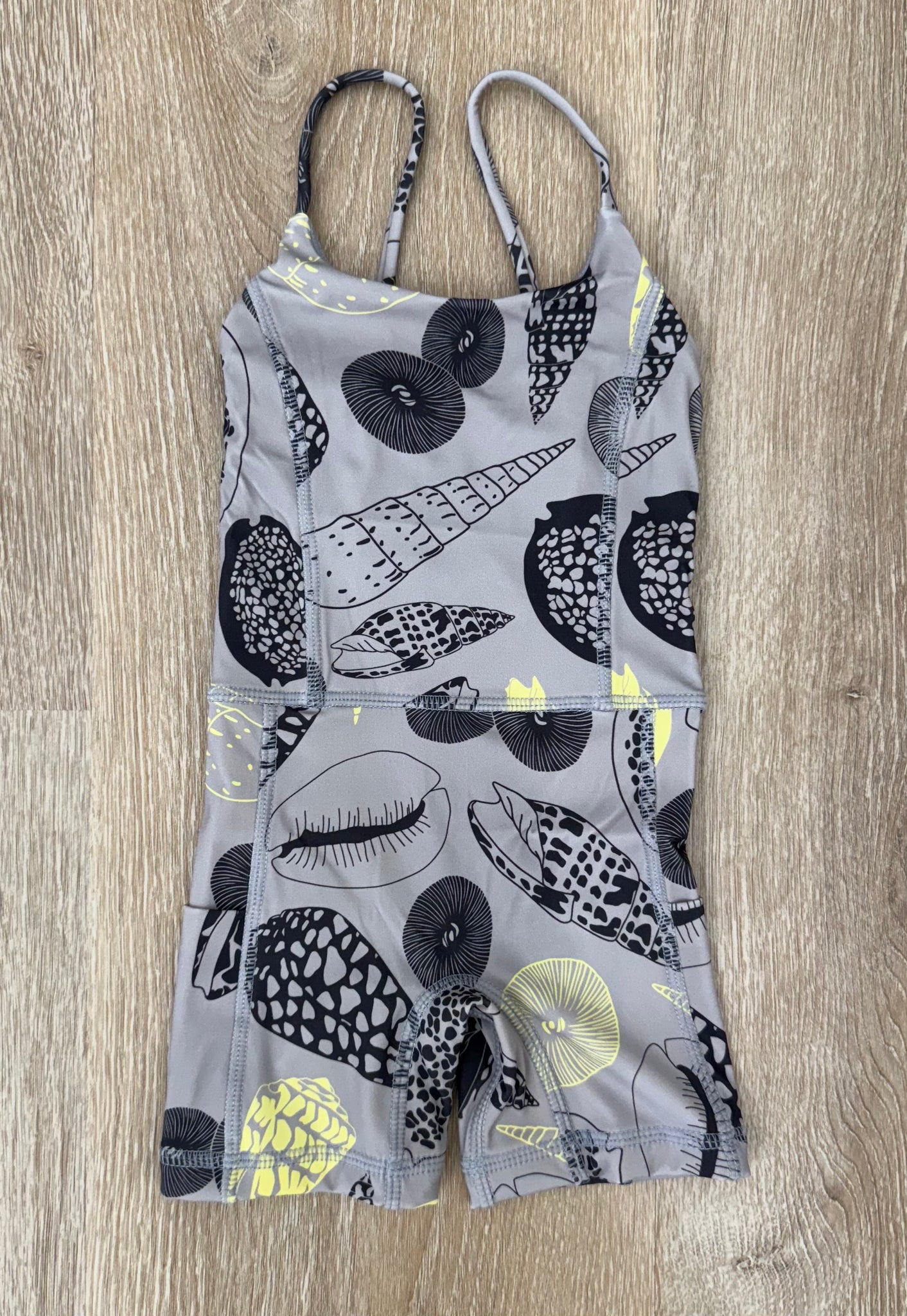 Shell print in yellow and charcoal on a gray spaghetti strap active romper. Strappy detailing in the back area with 2 pockets for convenience. Pictured is a size 2T.