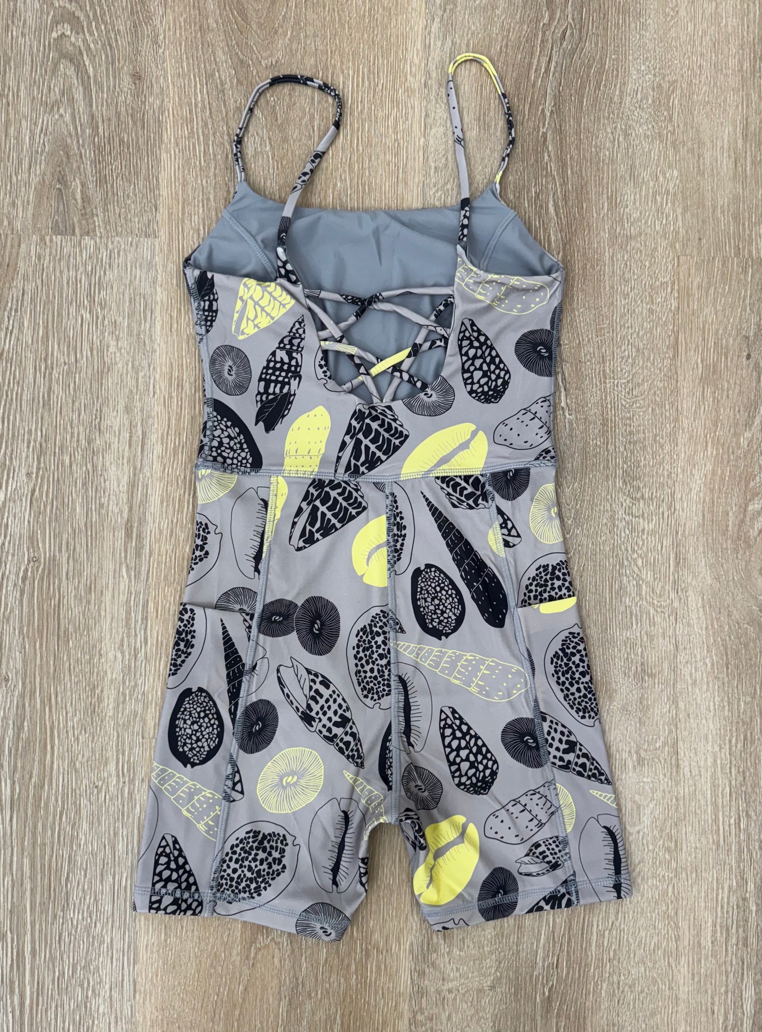 Shell print in yellow and charcoal on a gray spaghetti strap active romper. Strappy detailing in the back area with 2 pockets for convenience. Pictured is a size small.