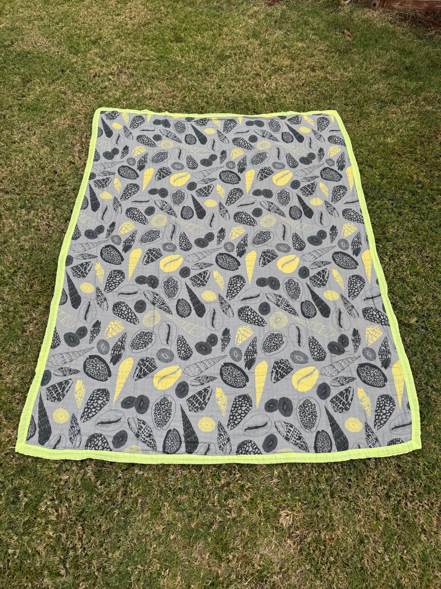 Two-sided muslin blanket with our gray shell print on one side and yellow gardenia on the other. Blanket measures 55x72 inches.