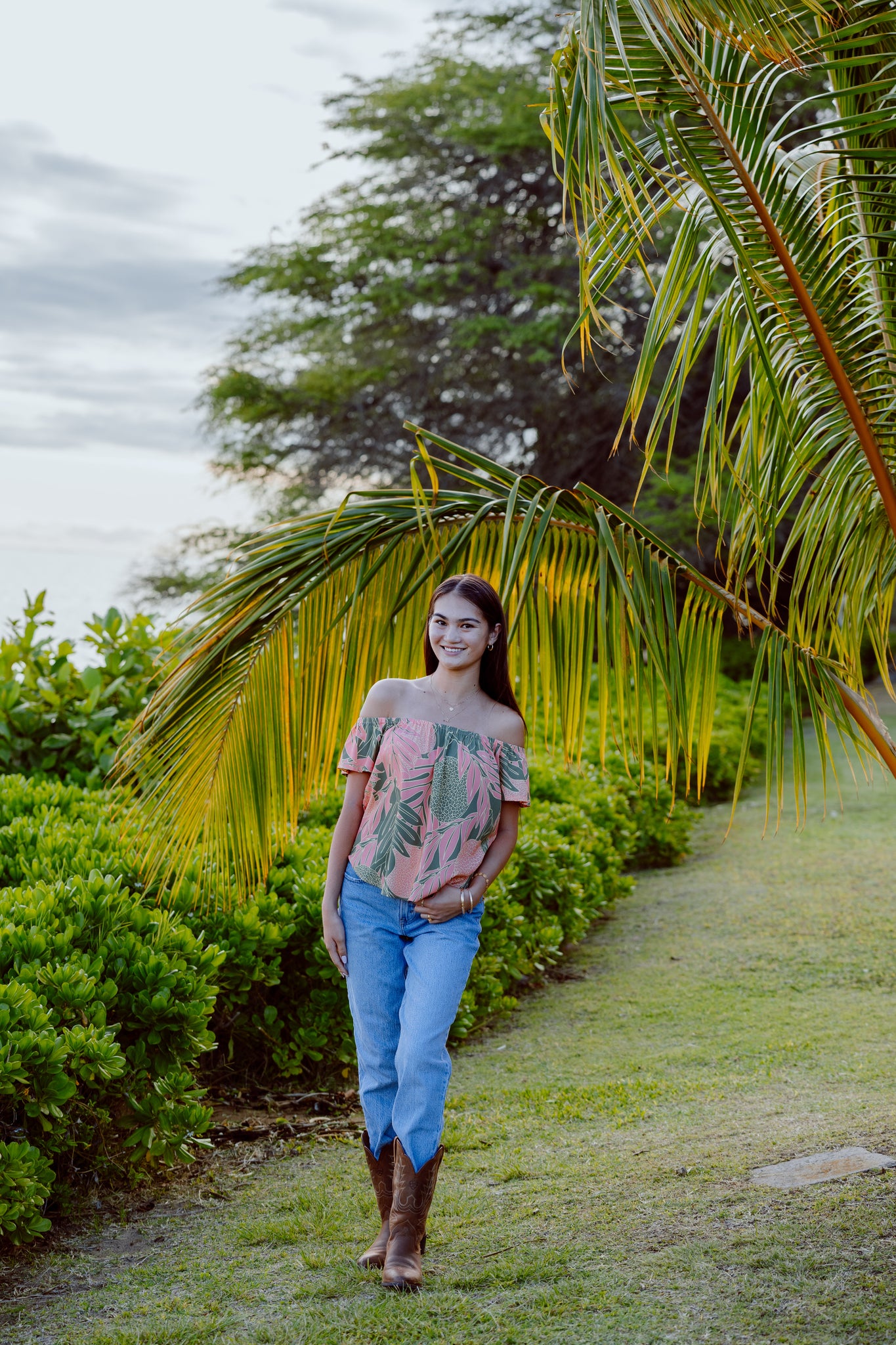 Ulu print in pink and green on an off the shoulder short sleeve top. Model wears a size small.