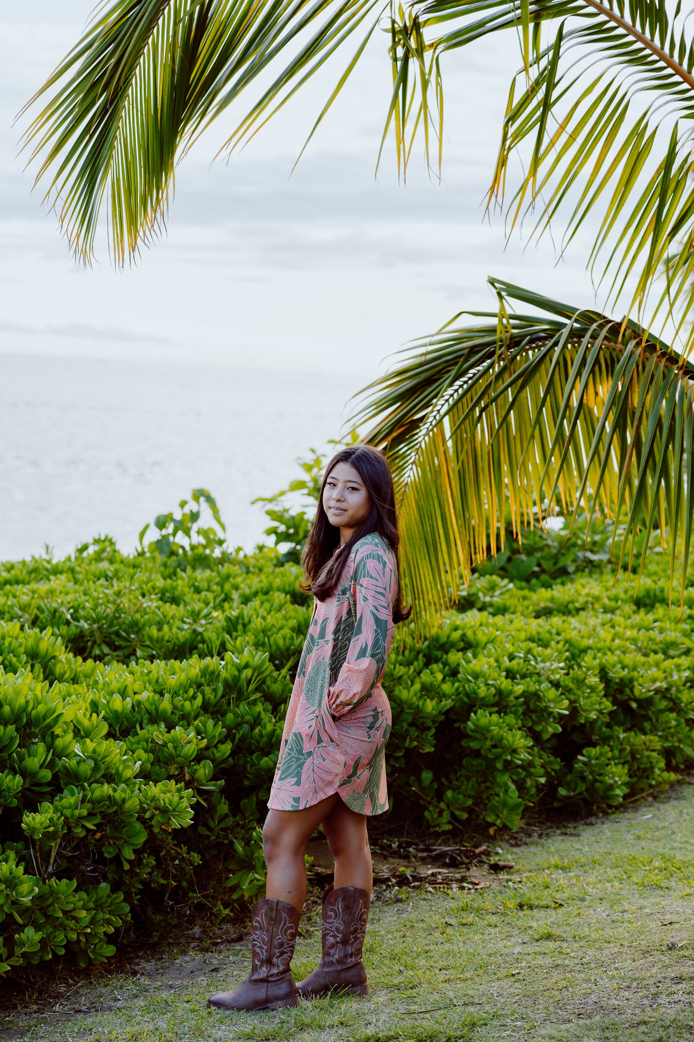 Ulu print in pink and green on a long sleeve dress with a mandarin styled collar and elastic sleeve cuffs. Model wears a size small.