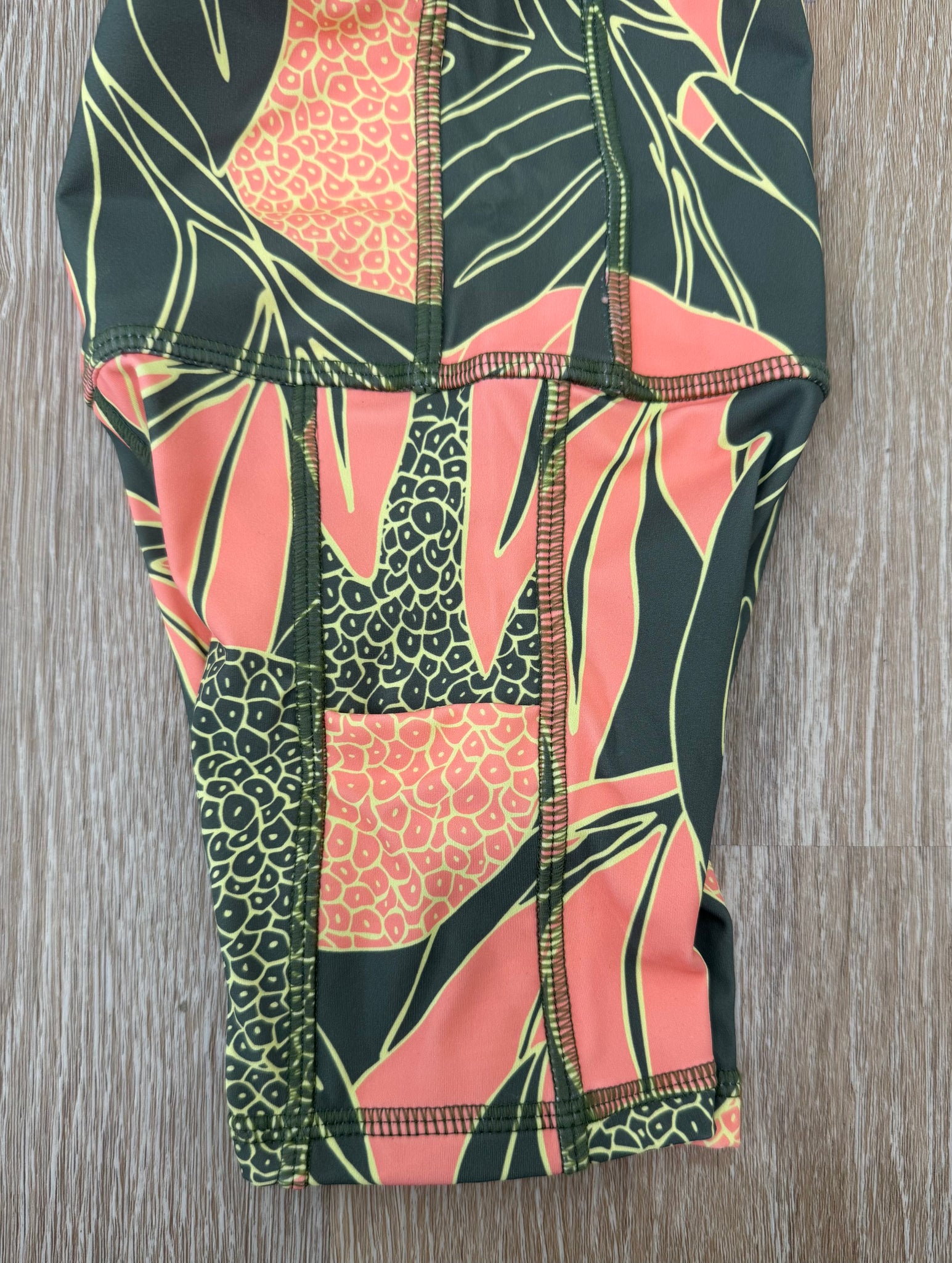 Ulu print in pink and green on a spaghetti strap active romper. Romper is buttery soft and has pockets on both sides. Pictured is a size 2T.