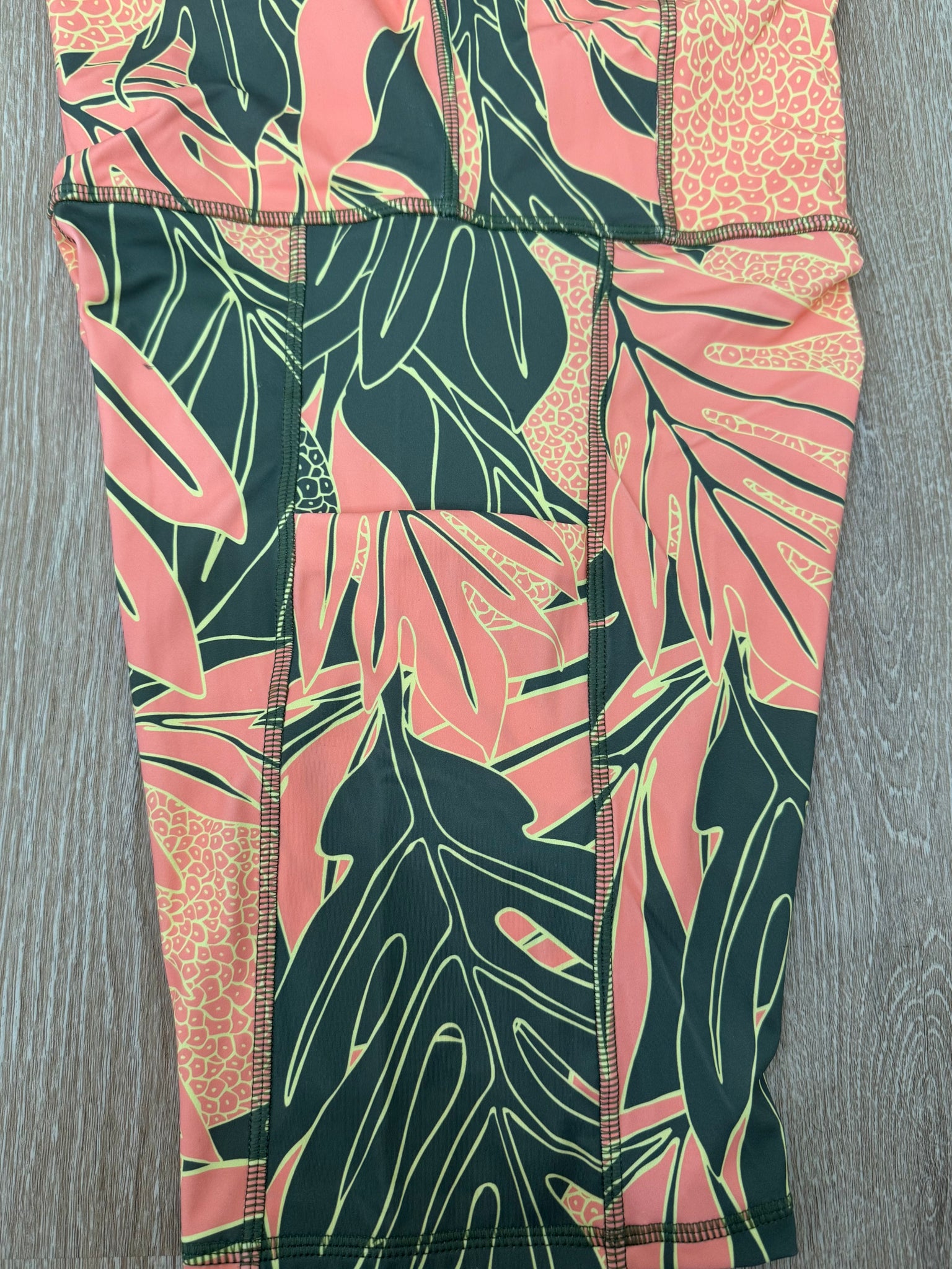 Ulu print in pink and green on a spaghetti strap active romper. Romper is buttery soft and has pockets on both sides. Pictured is a size small.
