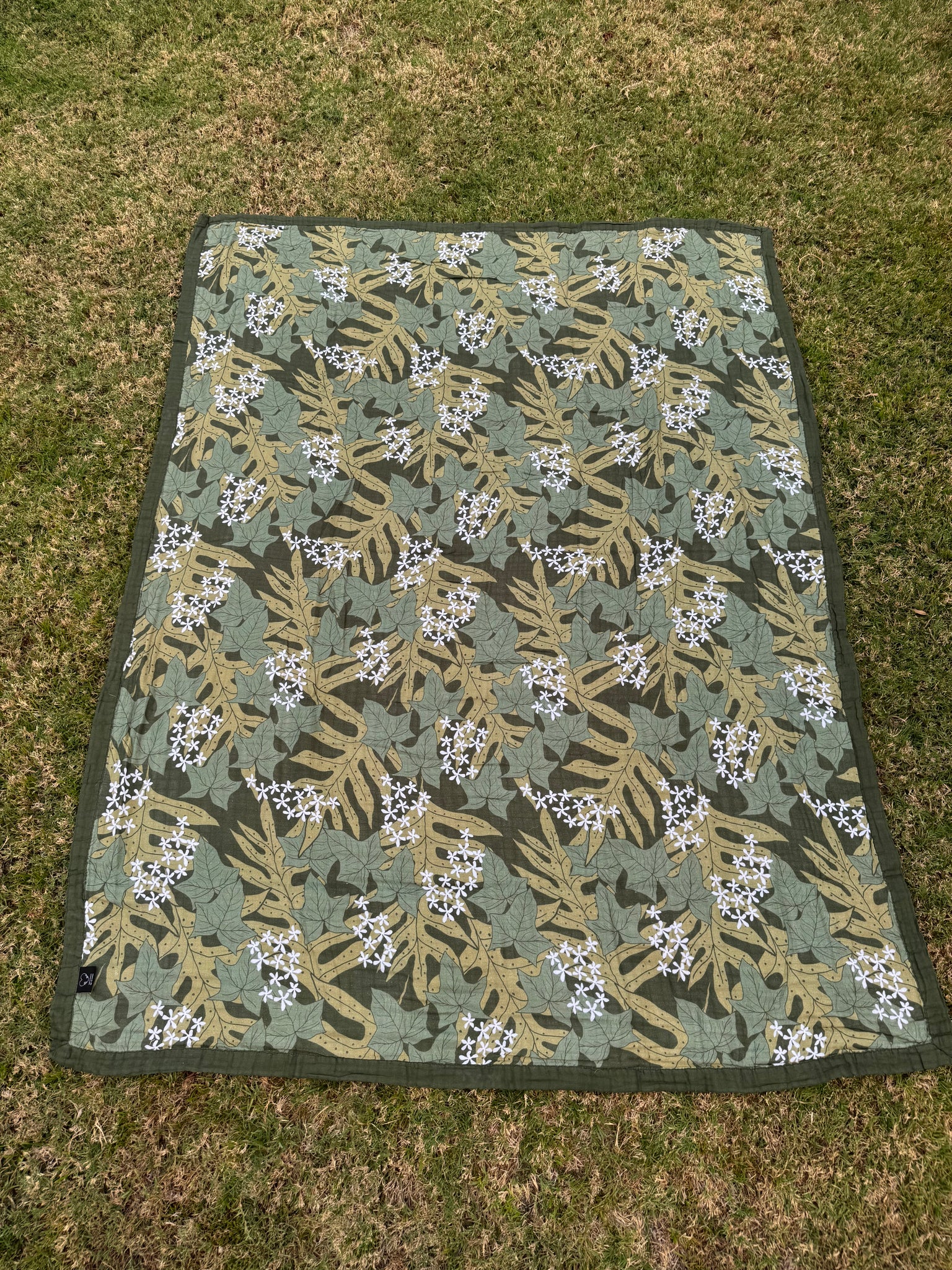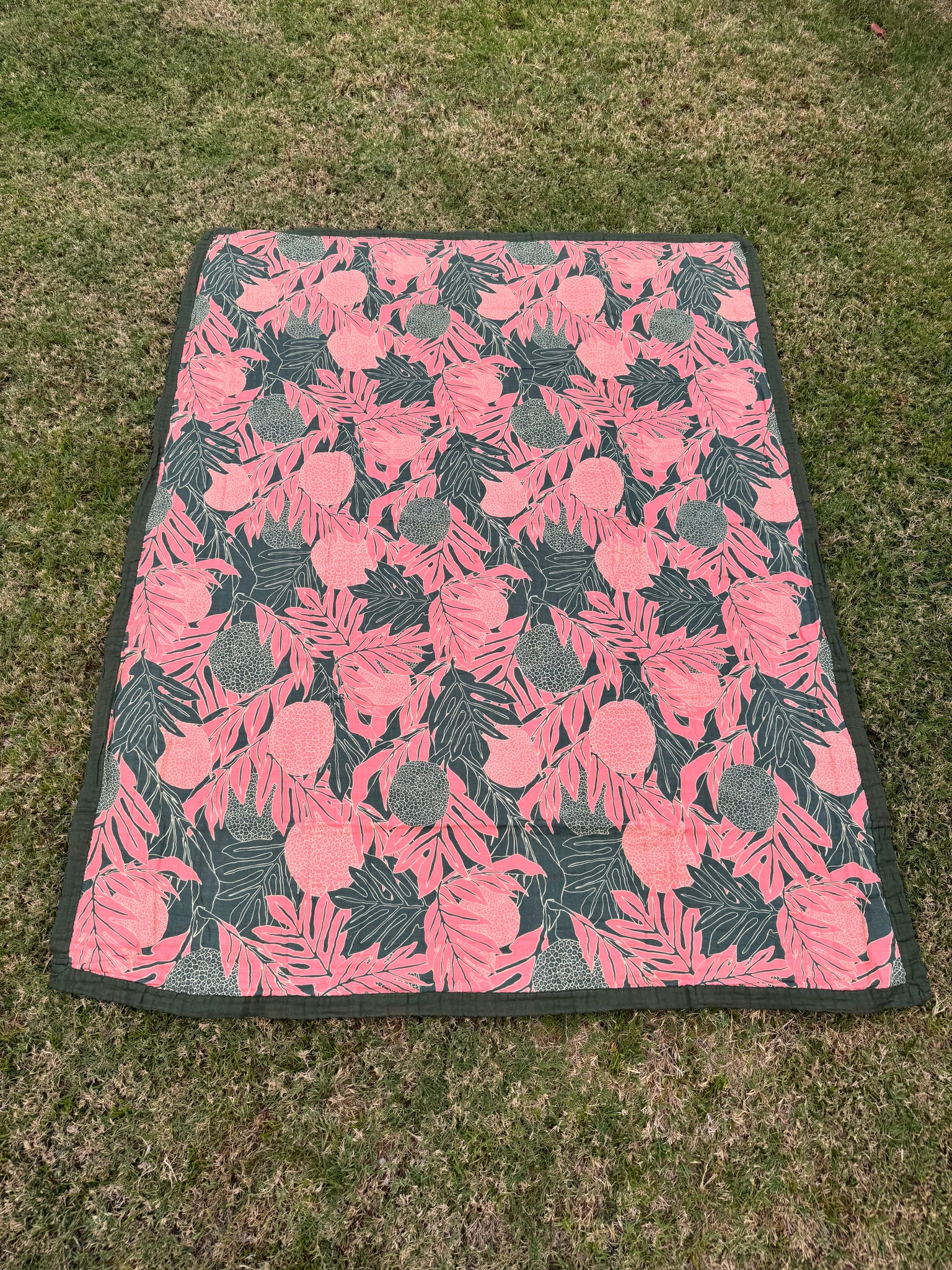 Two-sided muslin blanket with our pink ulu print on one side and Kukui print on the other. Blanket measures 55x72 inches.